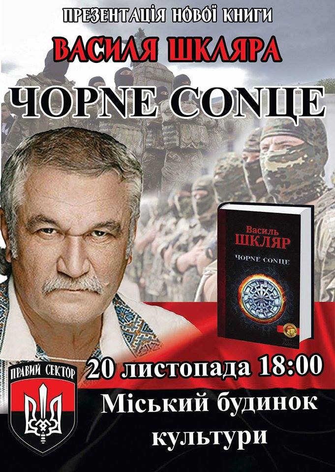 20 листопада, о 18:00, в Рівному, в Міському будинку культури, що по вул. Соборна 3д, на запрошення "Правого сектору" Рівненщини, автор бестселлерів "Чорний ворон, або Залишенець" та "Маруся" Василь Шкляр презентує свою нову книгу "Чорне сонце".