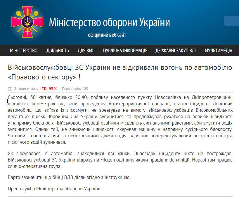 "Сьогодні, 30 квітня, близько 20.40, поблизу населеного пункту Новоселівка на Дніпропетровщині, в кількох кілометрах від зони проведення Антитерористичної операції, стався інцидент. Легковий автомобіль, що виїхав із лісосмуги, не зреагував на вимогу військовослужбовців Високомобільних десантних військ Збройних Сил України зупинитися, та продовжував рухатися на великій швидкості у напрямку блокпоста. Військовослужбовці освітили місцевість сигнальними ракетами, аби змусити водія зупинитися. Однак той, не знижуючи швидкості скерував машину у напрямку сусіднього блокпосту. Чатовий, спостерігаючи за небезпечними діями водія, здійснив попереджувальний постріл в повітря, після чого водій зупинився.